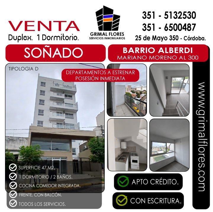 DEPARTAMENTO DÚPLEX A ESTRENAR – 1 DORMITORIO – BARRIO ALBERDI Viví en un dúplex moderno, listo para estrenar, con ambientes súper luminosos y una distribución ideal para tu día a día ✨. Cuenta con 1 dormitorio con placard 🛏️, 2 baños (uno completo y un toilette) 🚿🚻, y un living-comedor que invita a disfrutar cada momento 🛋️. Salí al balcón para tomar aire y despejarte 🌿, y aprovechá la terraza doble de uso común para relajarte o compartir un buen momento al aire libre ☀️. Ubicado en un piso 5 dentro de un edificio de 7 niveles, combina privacidad y comodidad 🏢. Superficie total: 49,60 m² (38 m² cubiertos) 📐. Expensas aproximadas: $110.000 ARS 💸. Apto para crédito ✅ y pet friendly 🐶🐱. Ideal para quienes buscan su primera vivienda o invertir en una zona con gran proyección dentro de Barrio Alberdi 📍. Contactanos y coordinamos una visita: te va a encantar 😉.