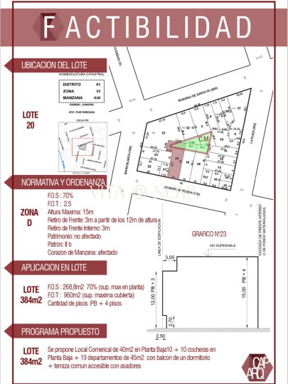 SE VENDE TERRENO APTO DESARROLLO EN BARRIO GENERAL PAZ Vita Nova Bienes Raíces ofrece a la venta excelente terreno con alto potencial de desarrollo inmobiliario, ubicado estratégicamente sobre calle Leonor de Tejeda al 900, entre Bahía Blanca y La Plata, en el corazón de Barrio General Paz. Ubicación privilegiada, a solo 3 cuadras de Av. 24 de Septiembre y Plaza Alberdi, CARACTERÍSTICAS DEL TERRENO - Superficie total: 384 m² - Zona / Perfil urbanístico: D - Estado actual: actualmente funciona como cochera en alquiler - Factibilidad comprobada: anteproyecto aprobado - Superficie máxima construible: 960 m² INDICADORES URBANÍSTICOS - FOS: 70 % - FOT: equivalente a 960 m² construibles - Altura máxima: 15 m - Retiro de frente: 3 m a partir de los 12 m de altura - Tipología permitida: edificio de Planta Baja + 4 pisos Ideal para desarrollo Lote apto para desarrollo de edificio residencial con posibilidad de local comercial y cocheras, en una zona consolidada SE ESCUCHAN OFERTAS / SE RECIBEN PROPIEDADES / VEHÍCULOS EN PARTE DE PAGO