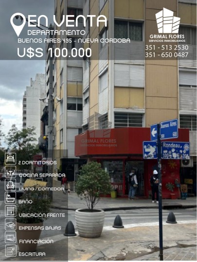 Hermoso depto. de 2 dormitorios, 5to piso frente, ubicado en calle Buenos Aires 495, pleno B° Nueva Córdoba, a cuadras del Paseo del Buen Pastor, como también de una de las avenidas más lindas Av. Hipólito Yrigoyen, Sanatorio Allende, universidades, Parque Sarmiento y Plaza España. Principales características: - Escritura - Cocina separada con muebles, artefactos de cocina y ventilación natural - Estar comedor amplio y luminoso - 2 dormitorios con placares e interiores, muy luminosos - Dormitorio principal amplio - 1 baño completo - Excelente ubicación - 55m² propios / 60m² totales (aprox.) - Financiación